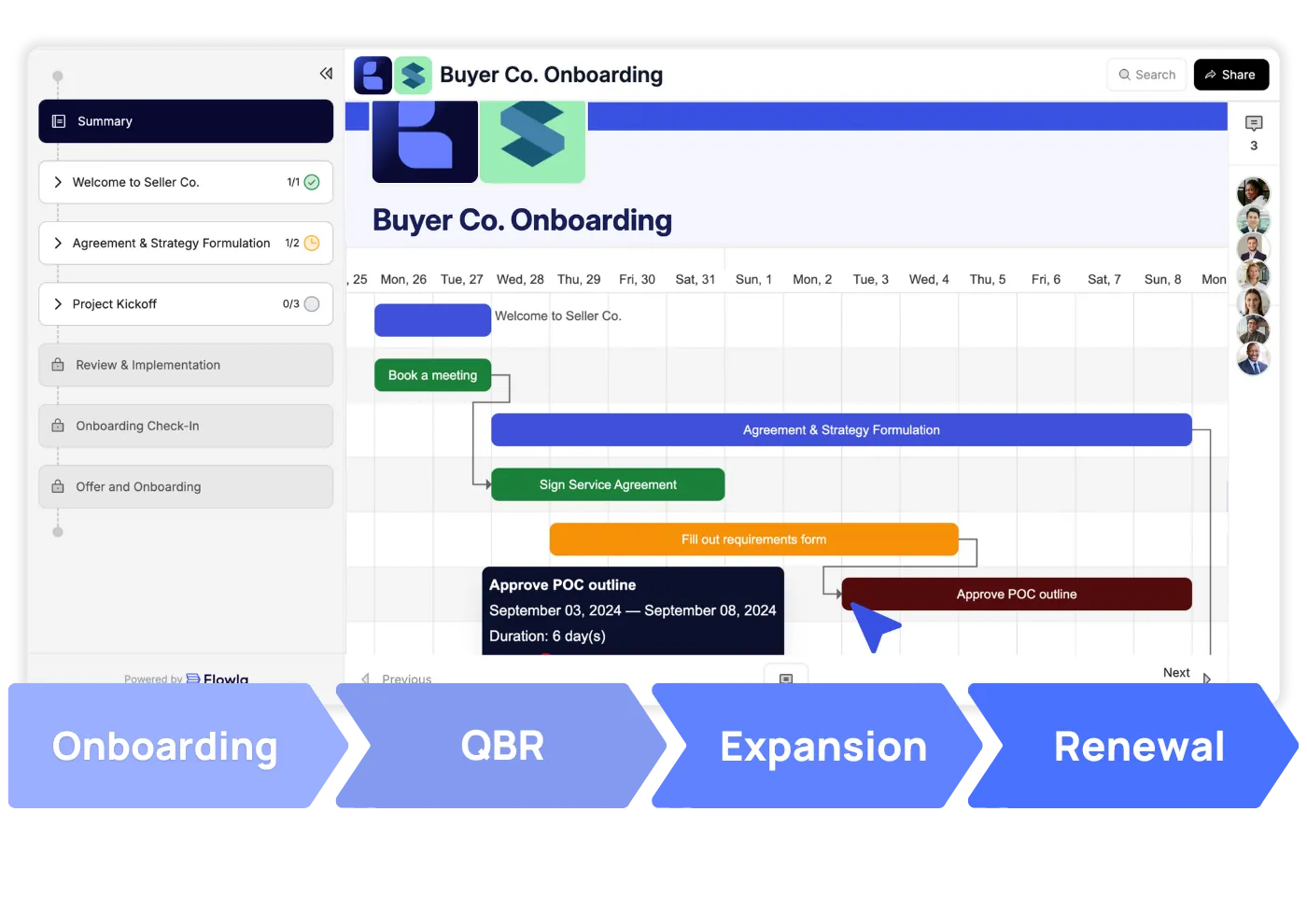 Flowla's interactive action plans are actionable & host content inside, so clients get things done in a single tab.