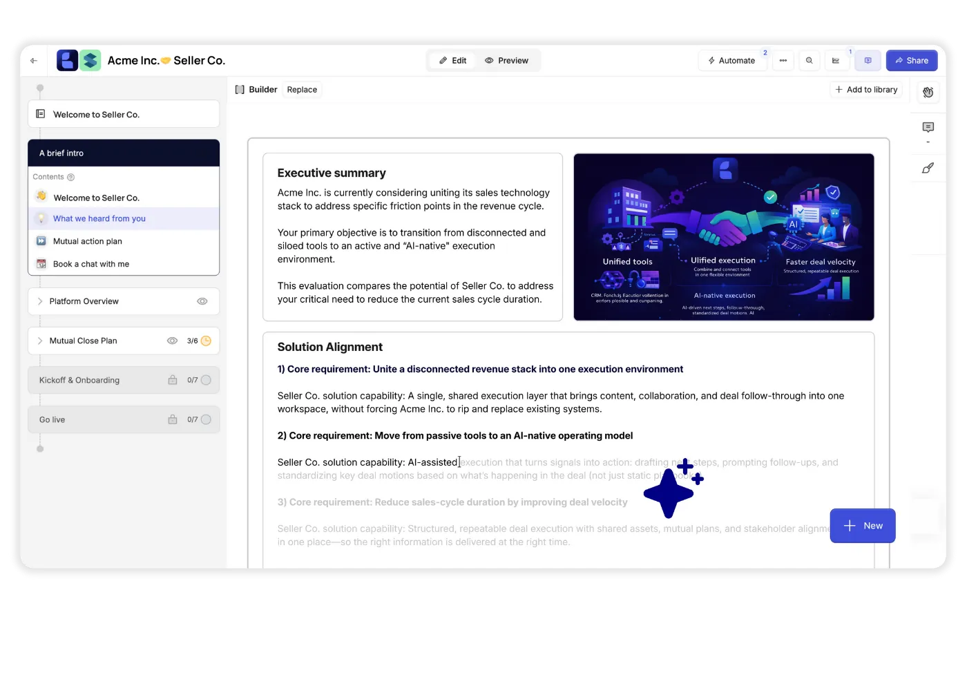 Save hours with AI building polished, standardized documents for reps using deal room history, call transcripts, and CRM data.